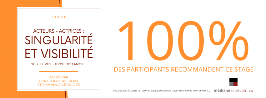 C’est le dernier résultat de notre sondage concernant notre stage “Acteurs, Actrices : Singularité et visibilité“, 100% des participants recommandent ce stage lancé l’été 2020 ! Et cela nous fait chaud au coeur.